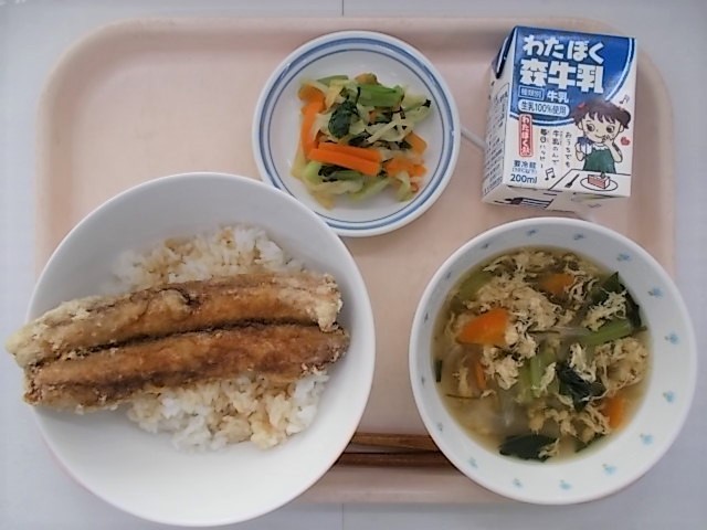 『さんまのかば焼き丼 牛乳 めかたま汁 おひたし』