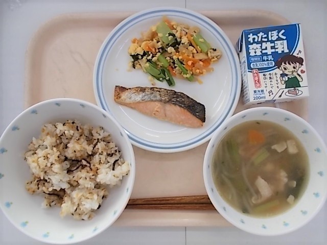 『昆布ごはん 牛乳 魚の照り焼き 糸寒天のスープ 千草和え』