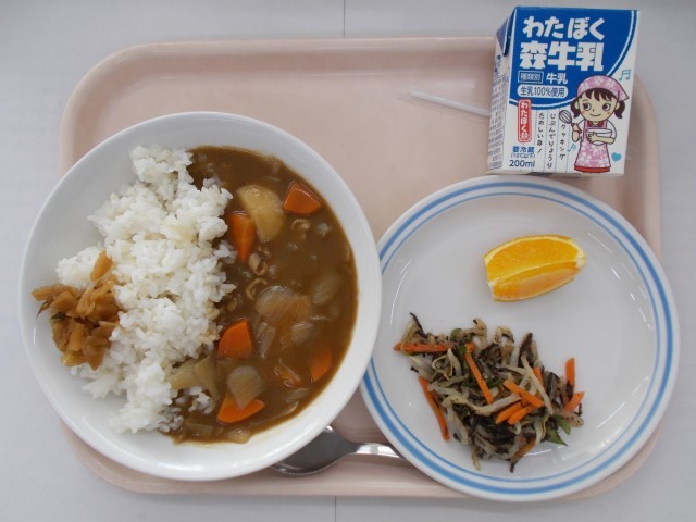 『カレーライス 福神漬 牛乳 大根とひじきのサラダ スイートスプリング』