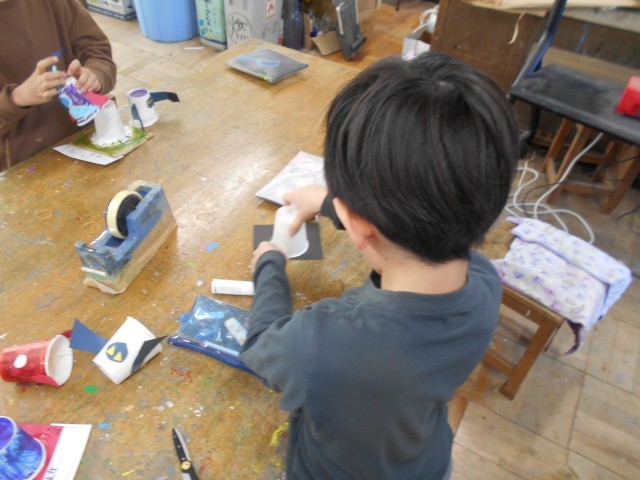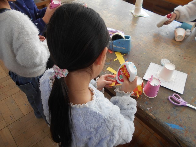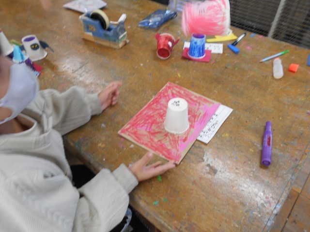 「とびだせピョーン」の活動に図工室で取り組んでいます。紙コップが、勢いよく飛び出す作品が作られていました。