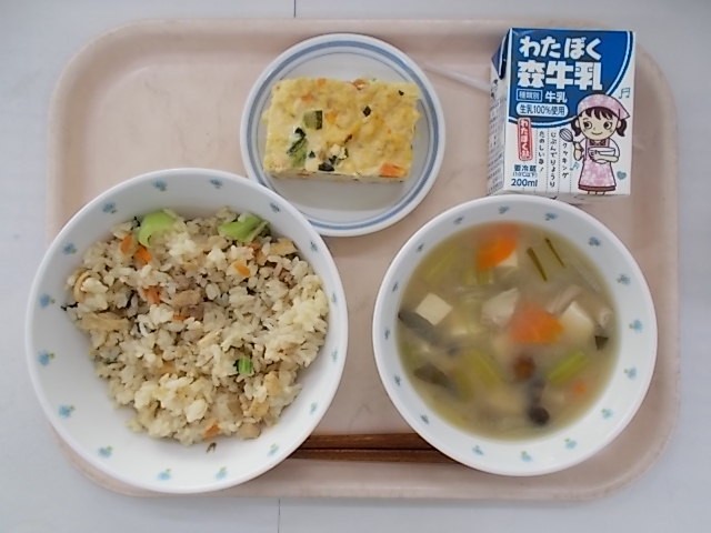 『五目ごはん 牛乳 擬製豆腐 田舎汁』