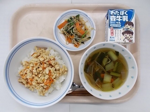 『高野豆腐のそぼろ丼 牛乳 わかめスープ もやしのおかか和え』