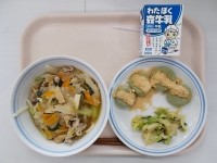 『わかめごはん 牛乳 肉じゃが煮 だし入り卵焼き』