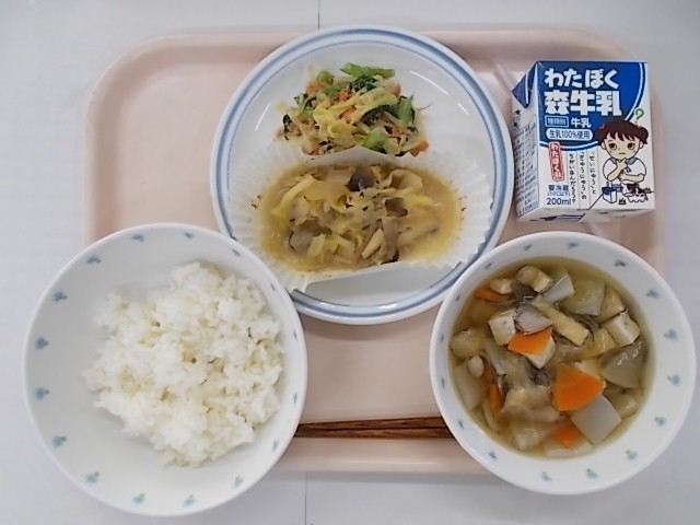 『ごはん 牛乳 魚のちゃんちゃん焼き けんちん汁 ごま和え』