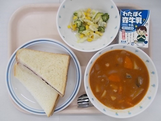 『二色サンド 牛乳 ポークシチュー ゆで野菜とコーンのサラダ』