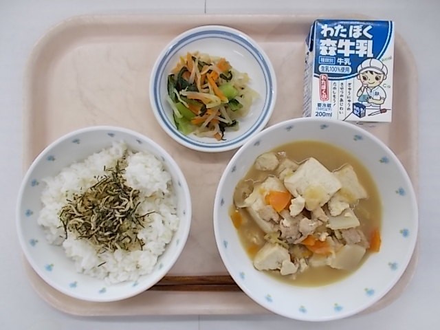 『ごはん じゃこふりかけ 牛乳 肉豆腐 三色浸し』