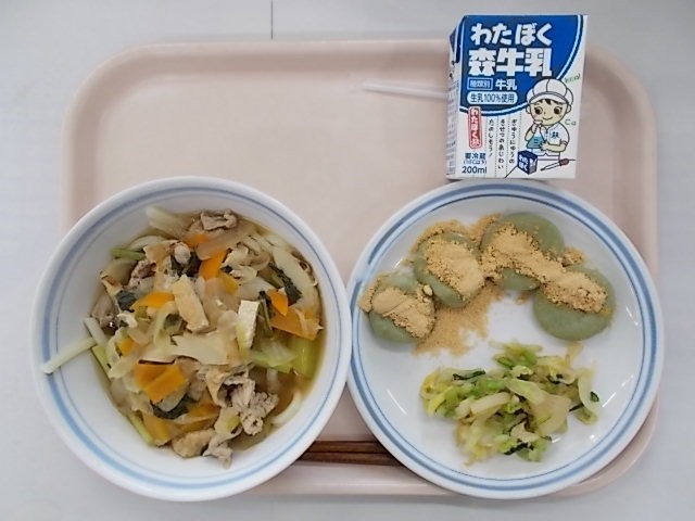 『五目うどん 牛乳 若草団子 キャベツとかぶの浅漬け』