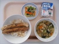 『大豆ピラフ 牛乳 キャベツとトマトのスープ わかさぎの唐揚げ』