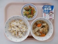 『豚肉と昆布の炊き込みごはん 牛乳 ふくさ卵 なめこ汁』 豚肉(群馬)、鶏肉(静...