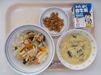 『うま煮丼 牛乳 かきたま汁 大豆とじゃこのカリカリ揚げ』 豆腐(愛知・佐賀)、...