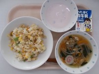 『五目ずし 牛乳 花丸スープ ブルーベリーヨーグルト ~前期終業式献立~』 卵(...
