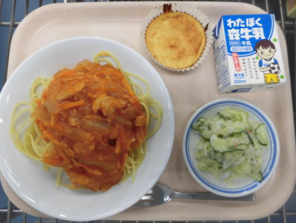 10月16日 ツナトマトスパゲティ シーザーサラダ スイートポテトのバスク風チーズケーキ 牛乳