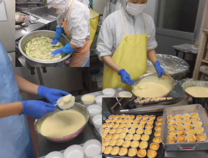 スパゲティは、茹でて油をまぶし、配りやすいようほぐしました。