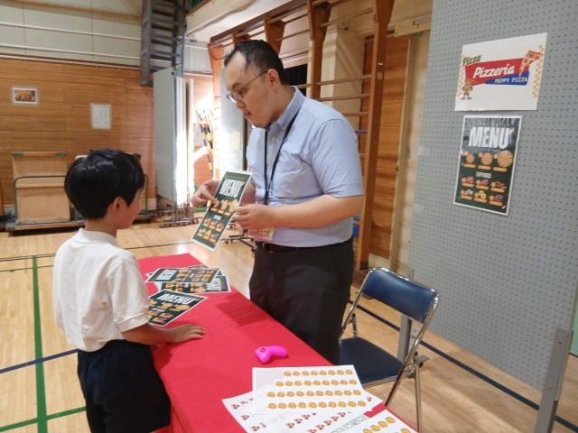 4年生は、ハンバーガーショップやアイスクリーム屋さんなどに行ったことを想定して、お店の人と英語でやりとりをしながら注文し、買った物のシールをもらいました。