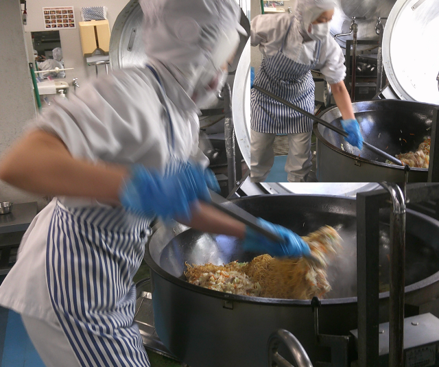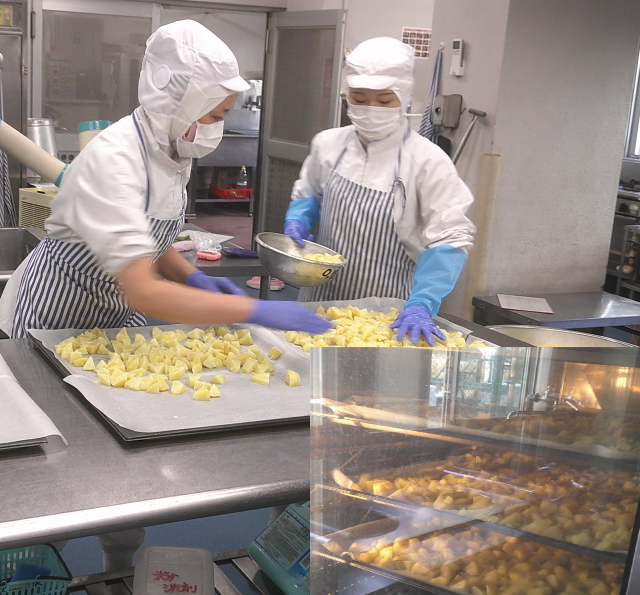 ソース焼きそばは、スチームコンベクションオーブンで野菜を蒸し、麺を蒸し、回転釜で炒めた具と合わせました。水っぽくならずにおいしくできました。カレーポテトもスチームコンベクションオーブンでじゃがいもを蒸してから、豆乳バターで和え、こんがり焼きました。ホクホクのじゃがいもの食感とバターのコクがおいしいです。フルーツポンチは、砂糖と水を煮た手作りのシロップと缶詰のフルーツを合わせました。各教室で配る直前に、冷やしたサイダーを注いでもらいました。やさしい甘さのひんやりデザートです。今日もよく食べてくれました。