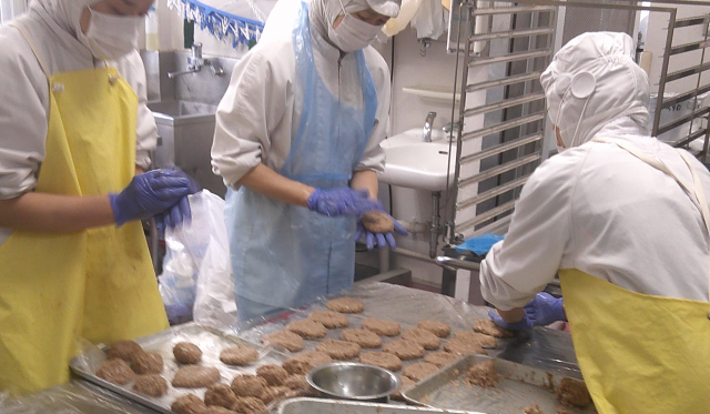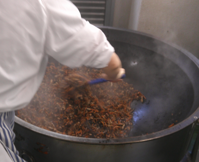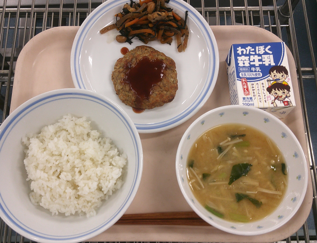 今日は千葉県の郷土料理の献立です。アジのサンガ焼きは、漁師料理の「なめろう」を山に行くときに焼いて持って行ったことから「山家焼き」と言われるようになったそうです。洋風にアレンジして見た目はハンバーグのようにしました。鯵のすり身と鶏ひき肉・たまねぎ・にんにく・パン粉塩・こしょう・かたくり粉・豆乳を入れて混ぜ合わせ小判型にし油をぬってオーブンで焼きました。ケチャップ・ウスターソース等を合わせたたれをかけました。ごはんとよく合います。ひじきの煮物は、ひじき・大豆・油揚げ・糸こんにゃく・にんじんをだし汁としょうゆ・酒・砂糖・みりんで味をつけてゆっくり煮含めました。甘めの味で、こちらもごはんによく合います。一汁二菜の和食献立です。今日もよく食べてくれました。
