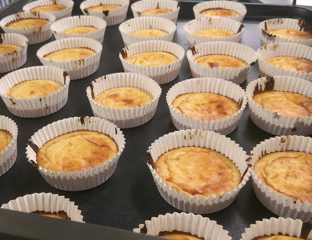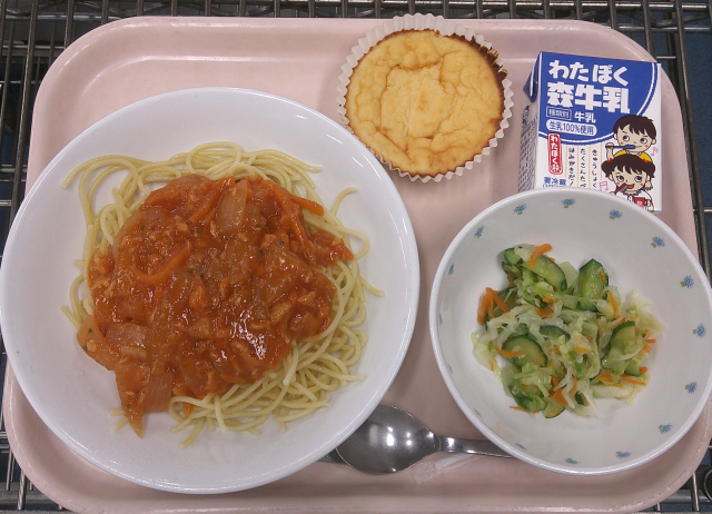 イタリア料理のパスタ・サラダとスペイン料理のデザートの献立です。ツナトマトソースは、にんにく・たまねぎをオリーブ油でじっくり炒め、にんじん・煮詰めたホールトマト・ケチャップ等を入れて煮ました。ツナ水煮フレークを入れ、ブラウンルウでとろみをつけコクを出しました。仕上げにみじん切りにしたパセリを入れました。スパゲティは、茹でて油をまぶし、配りやすいようにしっかりほぐしました。アルデンテ(固めのゆで具合)のスパゲティとツナトマトのソースがよく合います。イタリアンサラダは、キャベツ・人参・きゅうりを茹でて流水で冷やし、水を絞って冷蔵庫で冷やし、たまねぎ・オレガノ・オリーブ油を入れたドレッシングと合わせました。オレガノの香りがおいしいサラダです。スイートポテトのバスク風チーズケーキは、クリームチーズ・卵・生クリーム・牛乳・豆乳・砂糖・薄力粉・さつまいもを蒸してペースト状にしたものを合わせ、カップに入れて焦げ目がつくまで焼きました。本来のバスク風チーズケーキは黒くなるまで焦がしますが、食べやすいようにほんのり焦げ目をつけました。今日もよく食べてくれました。