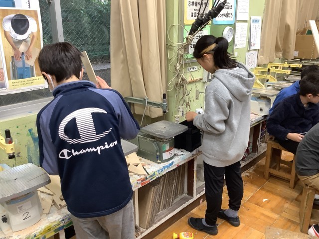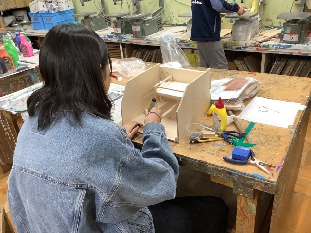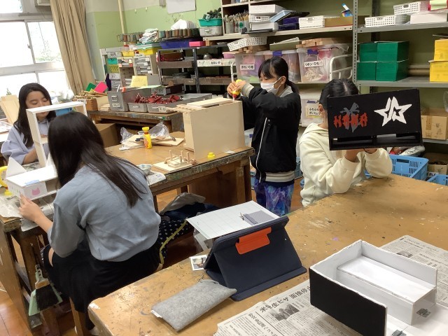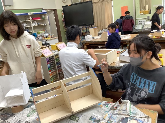 早速、図工の授業では「わたしはデザイナー」という内容で、ブックスタンドやお菓子を入れる箱など実用性がある作品を作っています。自分が好きな色やデザインに染めていきます。