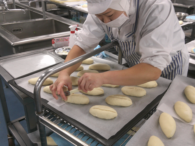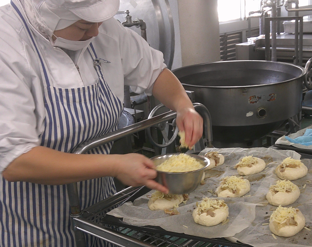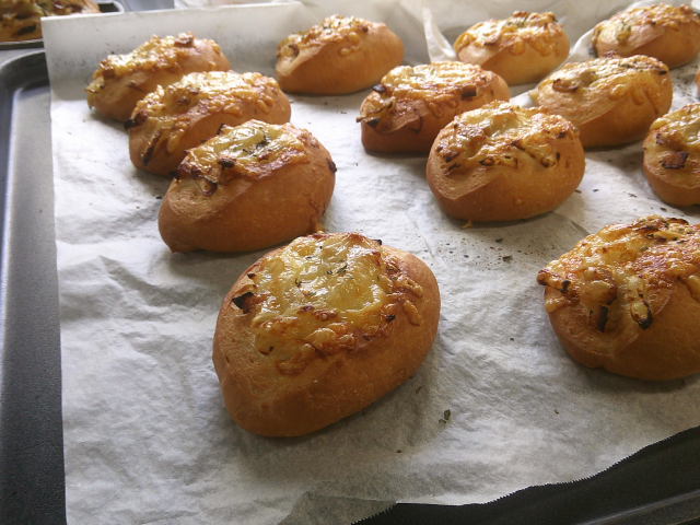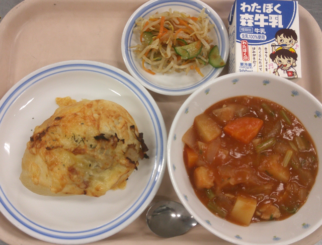 今日は手作りパンの献立です。チーズフォカッチャは、薄力粉・強力粉・ドライイースト・砂糖・塩・オリーブ油・水(ぬるま湯)を混ぜ合わせて生地を作ってこね、発酵させてから分割して丸め、濡れた布をかけて二次発酵させ、クッペ型に丸めて切れ目を入れたところに、炒めた玉ねぎ・ベーコンとピザチーズをのせ、スチームコンベクションオーブンで焼きました。ふっくらした生地と、こんがり焼けたチーズとベーコンがおいしいパンでした。朝早くから生地をこねる作業から分割・成型までと調理員さんが愛情込めて作ってくれたのでおいしくできました。トマトシチューは、ホールトマト・トマトピューレ・ケチャップを入れたその名の通りトマト味のシチューです。鶏肉・たまねぎ・にんじん・じゃがいもを鶏がらでとったスープで煮、ホールトマト・ピューレ・ケチャップを別鍋で煮詰めたものを入れました。カブを入れて少しやわらかくなってから手作りのブラウンルウも入れコクを出しました。茹でたカブの葉を入れて仕上げました。別鍋でトマト類を煮たので酸味が少なくまろやかな仕上がりです。茹で野菜サラダは、もやし・にんじん・きゅうりを茹でて流水で冷やし、たまねぎ入りのドレッシングと合わせました。今日もよく食べてくれました。