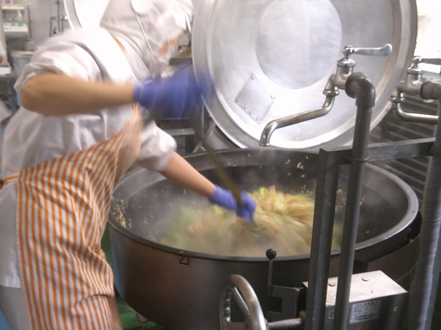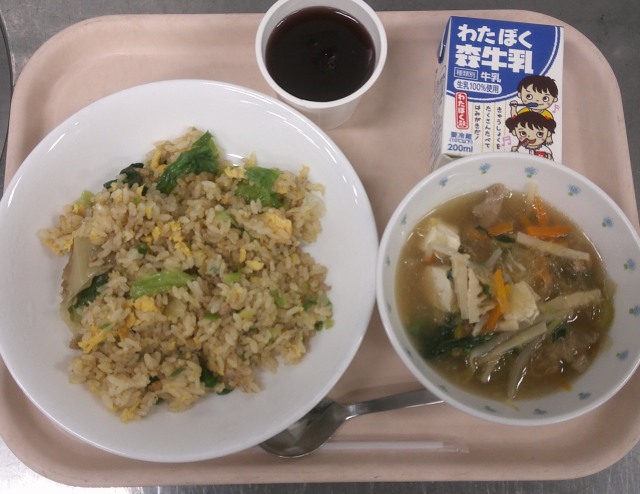 レタスチャーハンは、鶏がらでとったスープと塩・しょうゆを入れて米を炊き、具はにんにく・しょうが・豚ひき肉・長ねぎを炒めておき釜を熱して卵を入り、炊きあがったご飯と具を入れて炒め合わせました。5回に分けて炒めるので、パラパラのおいしいチャーハンができます。レタスは最後に入れて仕上げました。レタスの食感もおいしいチャーハンです。糸寒天の中華スープは、煮ても溶けない糸寒天を使用しました。豚肉・しょうが・たけのこ・にんじん・豆腐・小松菜・長ネギを入れた具だくさんのスープです。糸寒天は水で戻し、最後に入れて仕上げました。プルプルの寒天の食感が楽しいスープです。ぶどうゼリーは、ぶどうジュース・りんごジュース・砂糖を煮てカラギーナンで固めました。優しい甘さの手作りゼリーです。今日もよく食べてくれました。