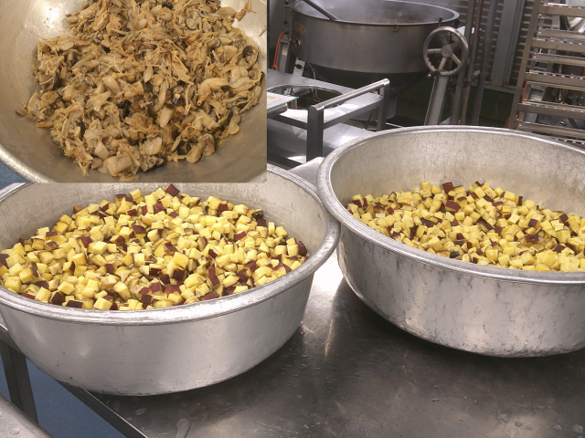 秋においしいさつまいもときのこを入れたカレーライスです。手作りのカレールウ・茶色くなるまでじっくり炒めた玉ねぎは同じですが、じゃがいもをさつまいもにしました。さつまいもは煮崩れないように、ひと口大に切ってスチームコンベクションオーブンで蒸し、仕上げに入れました。きのこは、えのきたけ・しめじをソテーして塩・コショウで下味をつけてこちらも仕上げに入れました。さつまいもの甘味がおいしいカレーライスでした。もやしのサラダは、もやし・きゅうり・にんじんを茹でて冷やして水を絞り、冷蔵庫で冷やし、玉ねぎ入りの手作りドレッシングと合わせました。今日もよく食べてくれました。