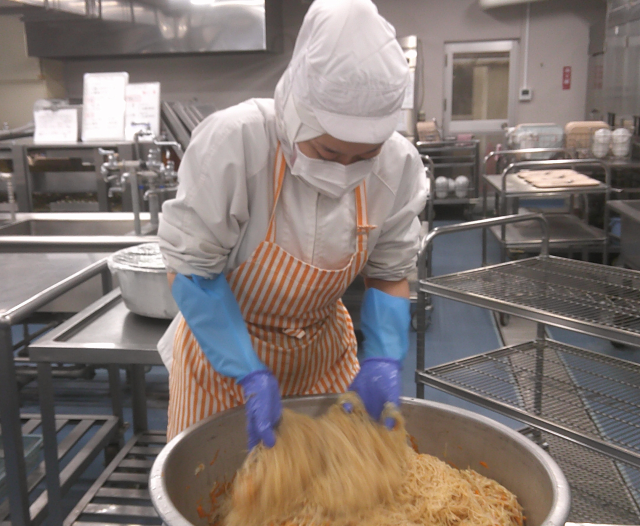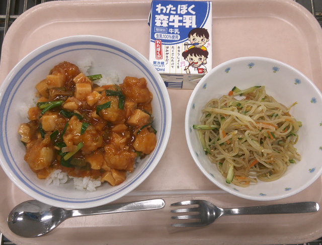 今日は中華風の献立です。豆腐とイカのチリソースは、油でにんにく・しょうが・ねぎを炒め、だし汁・砂糖・しょうゆ・トマトケチャップ等を煮てかたくり粉でとろみをつけ、下味をつけ、かたくり粉をまぶして油で揚げたいかと茹でた豆腐を入れて煮込み、ニラを入れて仕上げました。辛みはチリパウダーでつけましたが、控えめにしました。ごはんにかけて丼にしました。甘辛いソースとごはんがよく合います。春雨サラダは、緑豆春雨・もやし・にんじん・きゅうりをそれぞれ茹でて冷やし、直前にドレッシングと合わせました。白いりごまとごま油を入れて仕上げました。チリソースの後にさっぱりと食べられます。今日もよく食べてくれました。