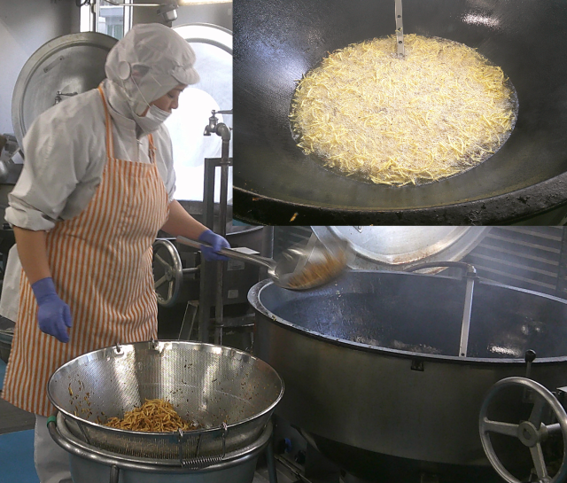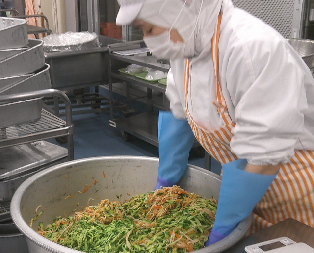 サンマー麺は神奈川県のご当地料理です。魚のさんまがのっているのではなく、肉野菜炒め入りのとろみのついた汁を中華麺にかけていただく料理です。中国語で「生(サン)馬(マー)麺」と書き、「生(サン)」は「新鮮な・シャキシャキとした食感」を意味し、「馬(マー)」は「上にのせる」という意味があるそうです。今日の具は、豚肉・たまねぎ・きくらげ・にんじん・もやし・キャベツ長ねぎ・もやし・ニラとたくさんの具を入れました。野菜たっぷりの汁まで飲み干せるラーメンです。切干大根の中華風サラダは、切干大根・きゅり・もやし・にんじん・だいこんを茹でて冷やし、ごま油入りのドレッシングと合わせました。切干大根と野菜の歯ごたえのおいしいサラダです。芋けんぴは新メニューです。さつまいもを細く切り、水にしっかりさらしてデンプンを取り、油でじっくり揚げてカリカリにし、砂糖・水・しょうゆを合わせて煮た蜜とからめました。カリカリの食感がおいしいデザートです。今日もよく食べてくれました。