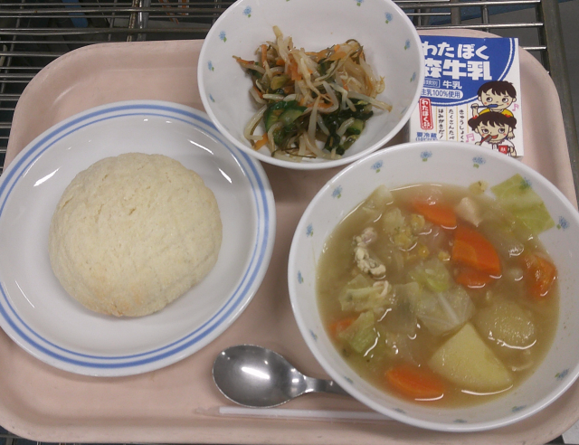 ★本日の給食食材産地★ 強力粉(岩手) 薄力粉(北海道) 豚肉(茨城) ホールトマト(イタリア) にんにく(青森) たまねぎ(愛知) セロリ(愛知) キャベツ(愛知) じゃがいも(北海道) にんじん(青森) きゅうり(宮崎) もやし(神奈川)
