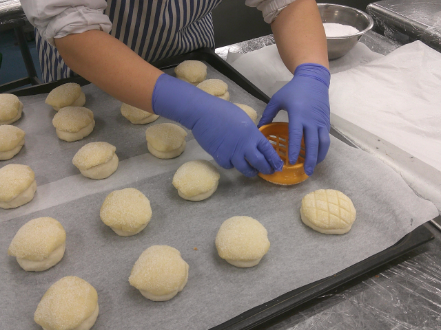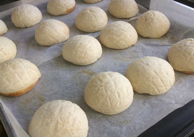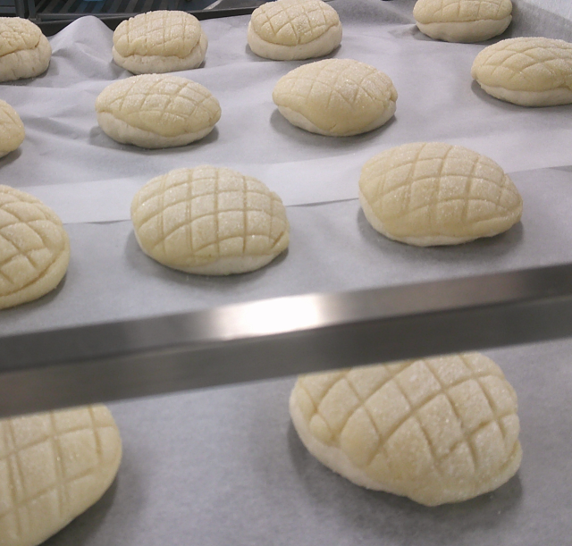 手づくりメロンパンの献立です強力粉・砂糖・豆乳バター・ドライイースト・豆乳・ぬるま湯で溶いた生地をこねて発酵させ、分割して丸めて二次発酵させた後にガス抜きをして丸め、薄力粉・豆乳・砂糖・豆乳バターで作ったクッキー生地を伸ばしてかぶせ、グラニュー糖を押し付けるようにつけ、格子状の型で模様をつけてスチームコンベクションオーブンで焼きました。クッキー生地はパン生地にかぶせるまで、冷蔵庫でよく冷やしました。サクッとしたクッキー生地と、ふんわりしたパン生地がおいしいメロンパンです。レンズ豆入り野菜スープは、オリーブ油でにんにくを炒めて香りを出し、鶏肉・野菜をいためてから豚骨でとったスープを入れて煮ました。レンズ豆は小粒なので、茹でずに洗ってすぐに入れられます。野菜の甘みが出たおいしいスープです。海藻サラダは、海藻ミックスときゅうり・もやし・にんじんを茹でて冷やしごま油を入れたドレッシングと合わせました。さっぱりと食べられます。今日もよく食べてくれました。