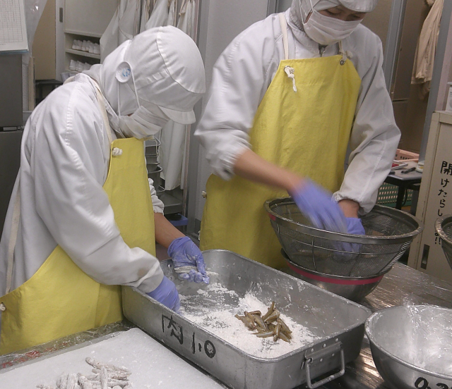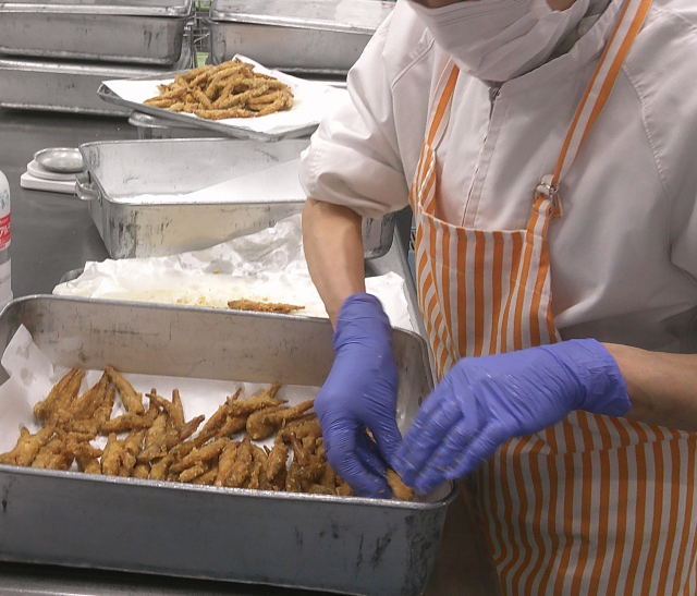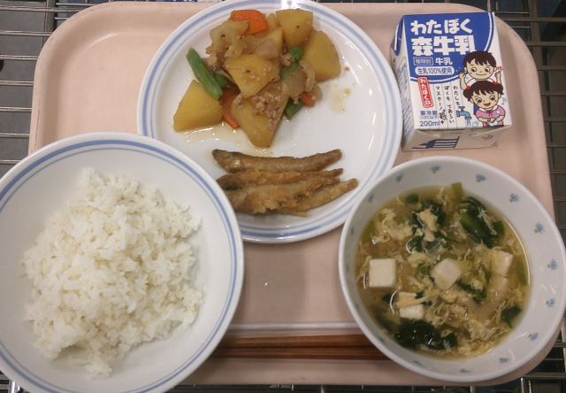 わかさぎのから揚げは、わかさぎに米粉とかたくり粉を合わせたものをまぶし、油でカラッと揚げました。骨ごと丸ごと食べられます。じゃがいものそぼろ煮は、ひき肉を炒め、にんじん・玉ねぎ・じゃがいもを入れて煮ました。とろみをつけて、茹でたさやいんげんを入れて仕上げました。じゃがいもに味がよくしみた煮物です。今日もよく食べてくれました。