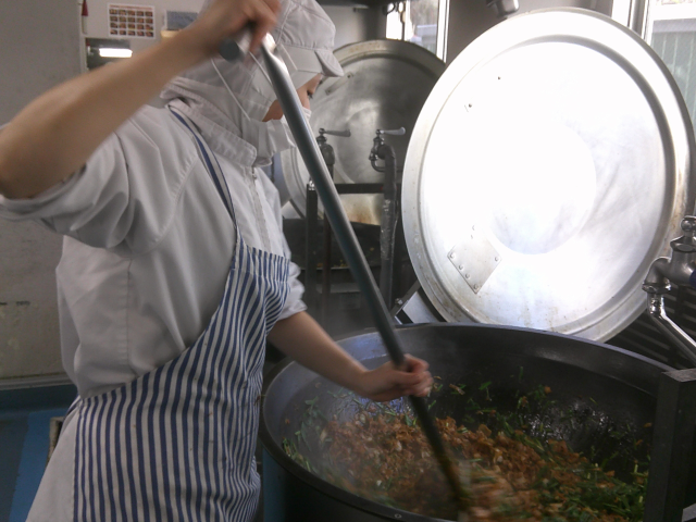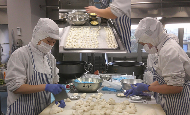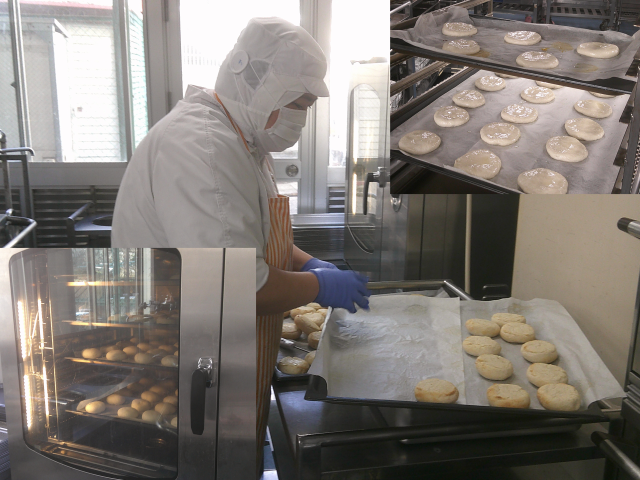 キムチ丼は、豚バラ肉・たまねぎ・長ねぎ・白菜・白菜キムチを炒め、コチジャン・八丁味噌・しょうゆ・砂糖で味をつけました。にら・ごま油を入れて仕上げました。2釜で作り、低学年と高学年で辛さに差をつけました。キムチの辛さとうま味がおいしいどんぶりです。わかめスープは、わかめ・豆腐・長ねぎを入れました。かつおと昆布のだしで、さっぱりとしたおいしいスープです。ホットクは韓国のおやきのようなお菓子です。白玉粉・強力粉・砂糖・ドライイースト・砂糖・塩・油を合わせ、30分ほどおいて発酵させた生地を分割して丸め、クリームチーズ・シュレッドチーズを合わせたものを包み、オーブンで焼きました。本場では、鉄板で焼いてヘラでつぶし平らにするそうです。中身は色々種類があるそうで、チーズや小豆餡などあるそうです。おやつや軽食として食べられるそうです。油をぬって平たくしてからオーブンで焼き、裏返してからさらに焼きました。外はカリッと、中はもっちりとしたホットクでした。今日もよく食べてくれました。
