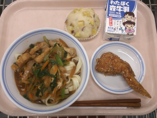 12月3日 みそきしめん 手羽先揚げ 鬼まんじゅう 牛乳