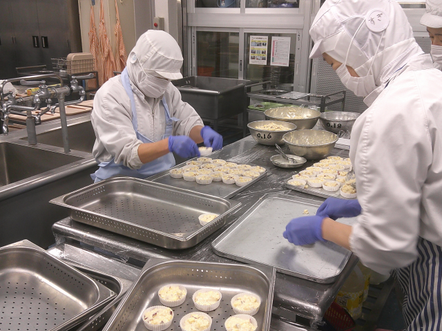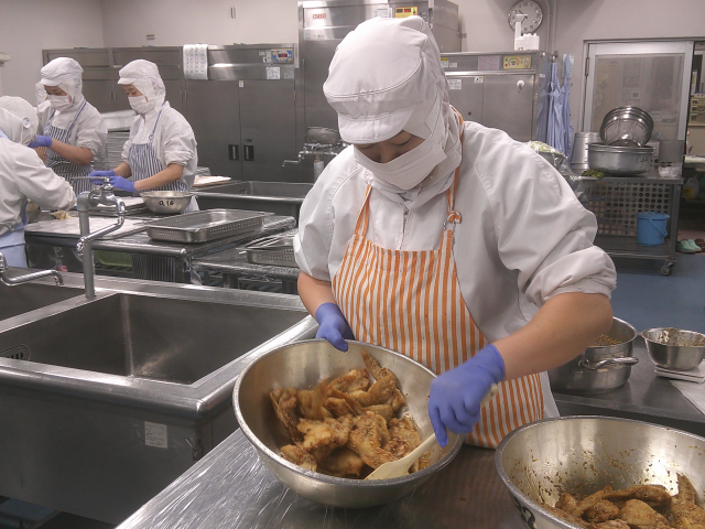 今日は愛知県の郷土料理の献立です。みそきしめん八丁みそで味付けた汁を作りました。教室で、きしめんと汁をどんぶりに盛り付けました。色は濃いですが、深みのあるみその風味がおいしい麺です。手羽先揚げは、片栗粉と米粉を合わせた粉を手羽先につけて揚げ、ごま入りの甘辛いたれを作ってからめました。中骨をとってもらった手羽先を使いました。鬼まんじゅうも愛知県の郷土料理です。さつまいもと小麦粉を合わせて蒸したお菓子です。角切りのさつまいもの角が鬼の角や棒のように見えることからこの名前が付いたそうです。さつまいもを角切りにし、砂糖をまぶしておき芋から出た水分も入れて、薄力粉・ベーキングパウダー・上新粉・水と混ぜ合わせ、カップに入れて蒸しました。さつまいもたっぷりのまんじゅうです。今日もよく食べてくれました。