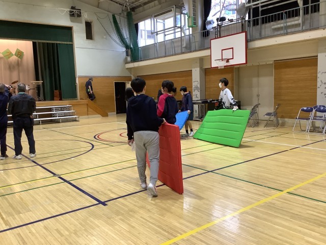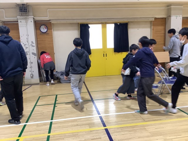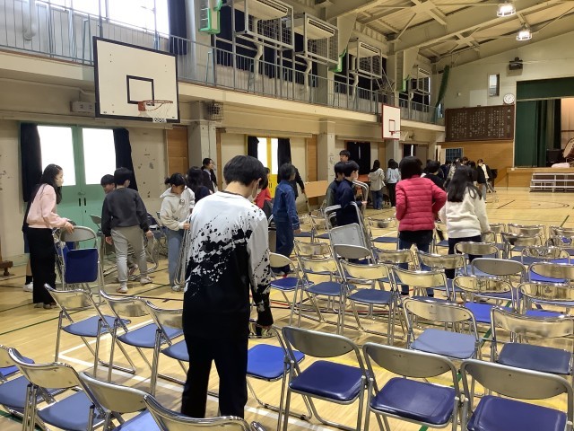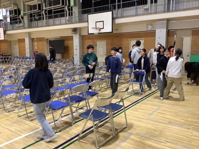 会場準備を行いました。パイプ椅子を綺麗に並べたり、雑巾で拭いたりと隅々まで協力して進めました。