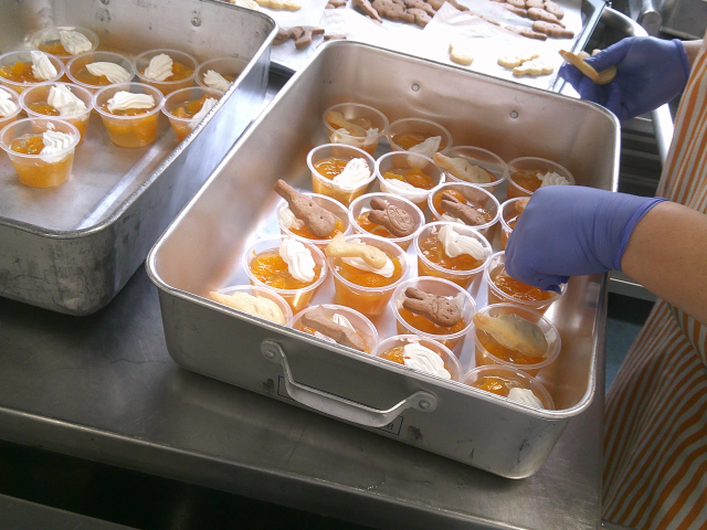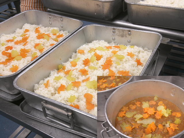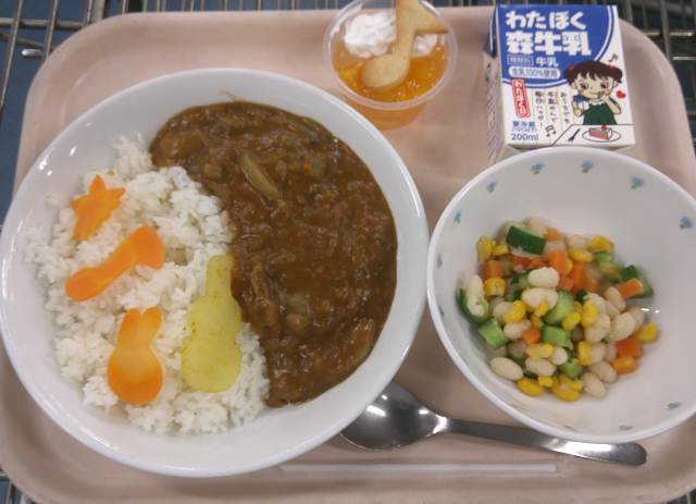 今日は冬野菜を入れたカレーライスです。たまねぎ・にんじんは入れましたが、じゃがいもを入れず、大根・ごぼうを茹でて、カレー粉をまぶしました。どちらもやわらかくしつつ、歯ごたえも残しました。にんじんと大根はおんぶなどに型抜きして、ごはんとルーに入れました。飴色たまねぎと手作りルウのコクがおいしいカレー冬バージョンです。コロコロサラダは、白いんげん豆・きゅうり・にんじんを茹でて、たまねぎ入りのドレッシングを合わせました。豆は茹でて熱いうちにドレッシングの一部をまぶして味をしみこませました。ミュージックパフェは、フルーツジュレをゼリーカップに入れて、ホイップクリームをのせ、手作りの型抜きクッキーをのせました。プレーンとココアと二色つくり、イオン部などいろいろな形に型抜きしました。ミュージックフェスタはみんな素晴らしい歌と演奏でした。今日もよく食べてくれました。