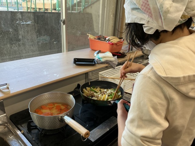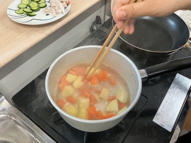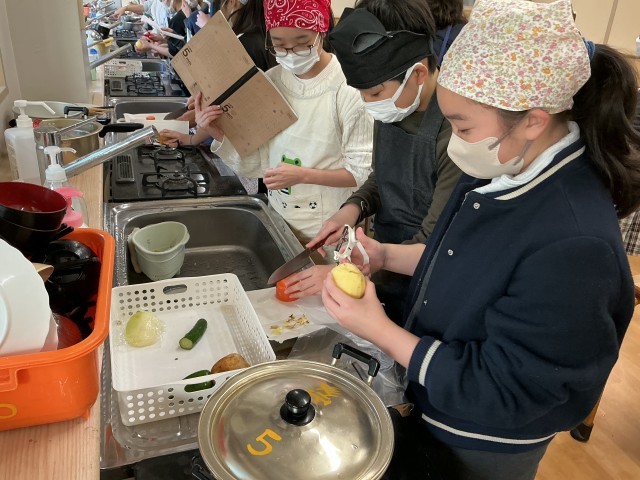 ジャガイモやにんじんの茹で具合を確かめるのが難しそうでしたが、班で協力して頑張っていました。