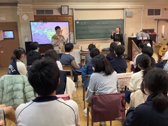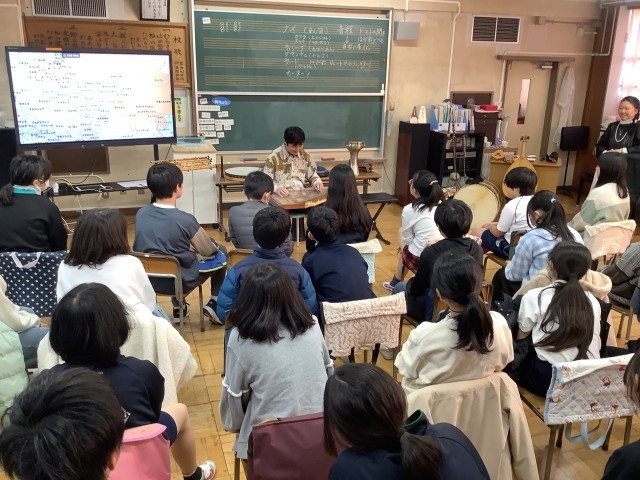 6年生は、「世界の音楽」の学習の一環として中東音楽演奏者の方をお招きして授業をしていただきました。