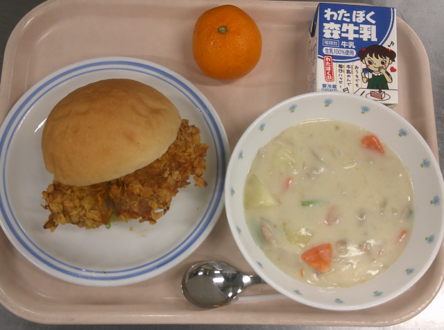 ザクザクチキンバーガーは、鶏肉に下味をつけ、片栗粉と豆乳を合わせたものをつけ、コーンフレークを粗目に砕いたものをつけて油をまぶし、オーブンで焼いたものを丸パンに茹でたキャベツとともにはさみました。ころもが「ザクザク」のおいしいチキンです。揚げている「パリパリチキン」の焼きバージョンです。揚げるより少ない油で作れます。クリームシチューは、冬においしいカブを入れました。手作りのホワイトルウを入れた優しい味のシチューです。みかんは、愛媛県の無茶茶園産です。甘くておいしいみかんでした。今日もよく食べてくれました。