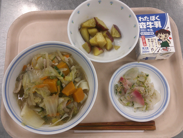 12月22日 ほうとう 赤かぶの甘酢漬け キャラメルポテト 牛乳