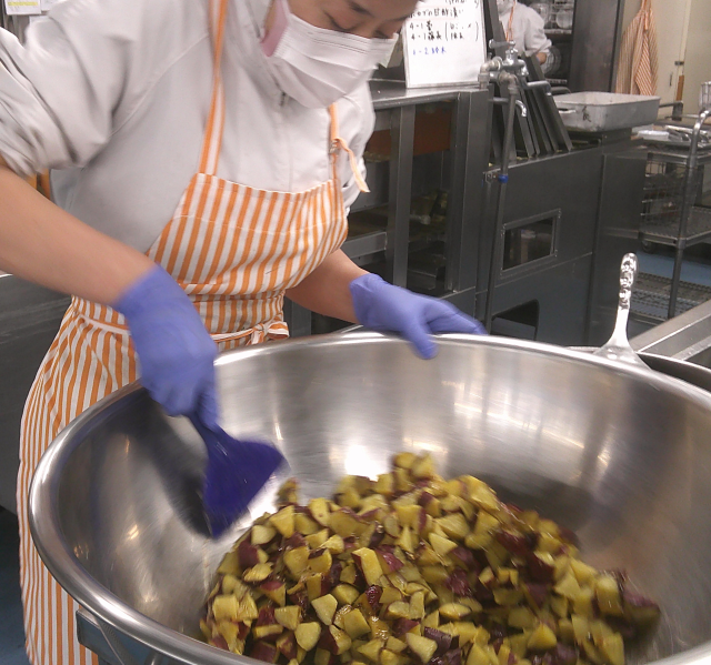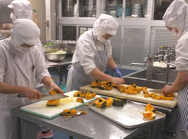 今日は冬至です。かぼちゃを使ったほうとうの献立にしました。ほうとうは、山梨県の郷土料理です。きしめんよりも少し幅広の麺を使います。汁は、赤みそ・白みそを入れて味をつけます。かぼちゃ・豚肉・にんじん・だいこん・ごぼう・白菜・長ねぎと冬においしい野菜がたっぷり入っています。かぼちゃは夏野菜ですが、昔は保存して、冬のビタミン補給として冬至に食べる習慣ができたようです。八王子の「とうきょう元気農場」産の「万次郎かぼちゃ」を使いました。赤カブの甘酢漬けは、かぶと赤カブを薄切りにしてさっと茹でて冷やし、甘酢に漬け込みました。途中何回かよく混ぜて味をしみこませました。白ごまを入れて仕上げ、風味を良くしました。赤カブの中は白いのですが、酢をつけることで赤く発色し中まで赤くなります。かぶの葉もきざんで茹でて、入れました。カブの白・赤カブの赤・葉の緑と彩りの良い甘酢漬けでした。キャラメルポテトは、蒸して焼いたさつまいもと豆乳バター・水・砂糖を煮立たせたキャラメルソースを合わせました。さつまいもは、千葉県多古町産の「べにはるか」です。甘くておいしいさつまいもで、甘めのキャラメルソースとよく合いました。今日もよく食べてくれました。