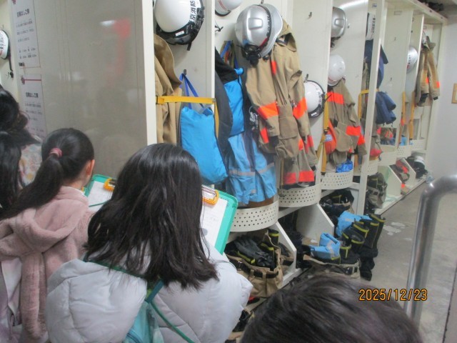 消防については学校で学習していたこともあり、消防署の方々の話や見せていただいた道具・設備などに興味津々でした。