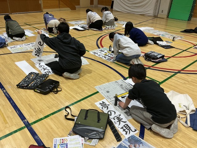 広い体育館で心を落ち着かせて、「夢の実現」と書きました。