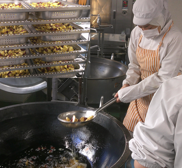 ちゃんこうどんは、ちゃんこ鍋をイメージしたうどんです。鶏肉・だいこん・白菜・油揚げ・かまぼこ・長ねぎ・にらと具だくさんです。仕上げにおろしにんにくを入れました。汁と、茹でたうどんを教室でどんぶりに入れて合わせてもらいました。具材と厚削り節でとっただしのうま味が出た汁です。じゃこ入り和風サラダは、だいこん・にんじん・きゅうり・くきわかめをそれぞれ茹でて冷やし、ドレッシングと合わせ、乾煎りしたじゃことごまを混ぜました。蒸して冷やした焼きちくわも入れました。茎わかめの歯ごたえがおいしいサラダです。大学芋は定番のさつまいも料理です。蒸してから素揚げしたさつまいもに、水あめや砂糖・しょうゆなどを入れて煮た蜜をからめました。大好きな児童が多い料理です。今日もよく食べてくれました。