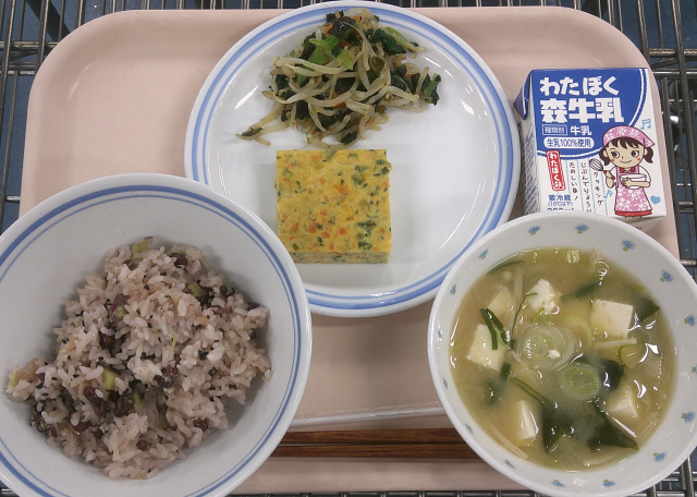 1月15日 さつまいもと小豆のおこわ みそ汁 千草焼き 磯香あえ 牛乳