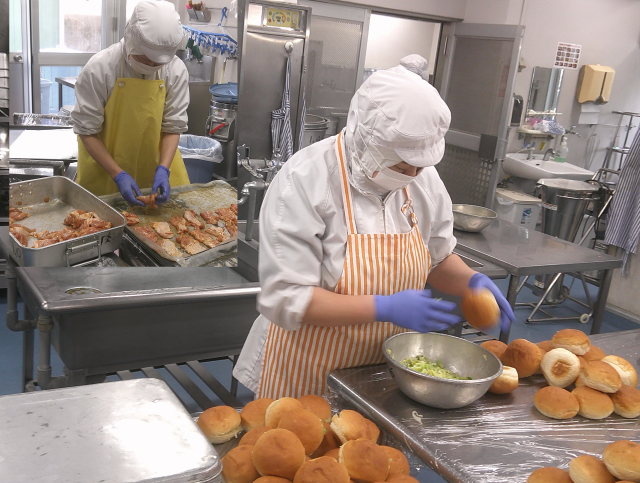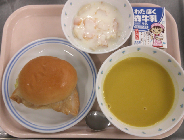 ジャークチキンバーガーは、ジャマイカ料理です。鶏もも肉に塩・おろしたにんにく・レモン汁・パプリカ・クミン・チリパウダー・こしょう・オリーブ油を合わせたものを漬け込み、オーブンで焼いた後切れ目を入れた丸パンに、茹でたキャベツと一緒にはさみました。チキンがスパイシーな味と香りがしますが、辛さは控えめです。本場のジャマイカでも、スパイスの配合はそれぞれらしく決まった配合はないそうです。市販で「ジャークシーズニング」というミックススパイスが日本でも手に入るそうです。パンとキャベツと一緒に食べると、スパイシーさも中和されて食べやすいです。パンプキンスープは、かぼちゃの手作りポタージュです。玉ねぎを炒めて、かぼちゃ・水に浸した米・鶏がらでとったスープを入れ煮、ミキサーにかけてなめらかにし、牛乳・豆乳を入れて弱火で煮ました。かぼちゃの甘さがおいしいスープです。フルーツヨーグルトは、プレーンヨーグルトに砂糖を入れ、みかん缶・パイン缶・黄桃缶を入れて合わせました。やさしい甘さのデザートです。今日もよく食べてくれました。