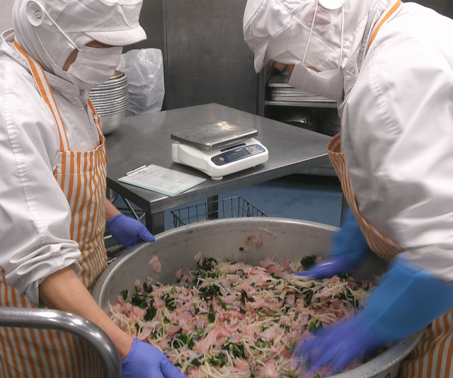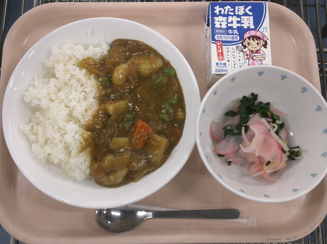 明日1月22日は「カレーの日」だそうです。一日早いですが、カレーの献立にしました。シーフードカレーは、にんにく・しょうがを炒めて香りを出し、たまねぎ・セロリを入れてさらに炒め、鶏肉を入れて炒めた後に鶏がらでとったスープやチャツネ・飴色に炒めたたまねぎ等を入れて煮ました。手作りのカレールウを入れさらに煮込みました。いか・えびは、茹でて白ワインをふっておきました。いったん火を止めて寝かせておき、再度加熱してから、いか・えびを入れました。彩りに茹でたさやいんげんも入れました。シーフードの食感が楽しいカレーです。レディサラダとほうれん草のサラダは、神奈川県三浦市特産のはつかだいこん「レディサラダ」を茹でて冷やし、茹でたほうれん草・もやし・ドレッシングと合わせました。レディサラダは、苦みや辛みがほとんどなく、甘みがあるのでサラダにぴったりです。今日もよく食べてくれまえしあした。