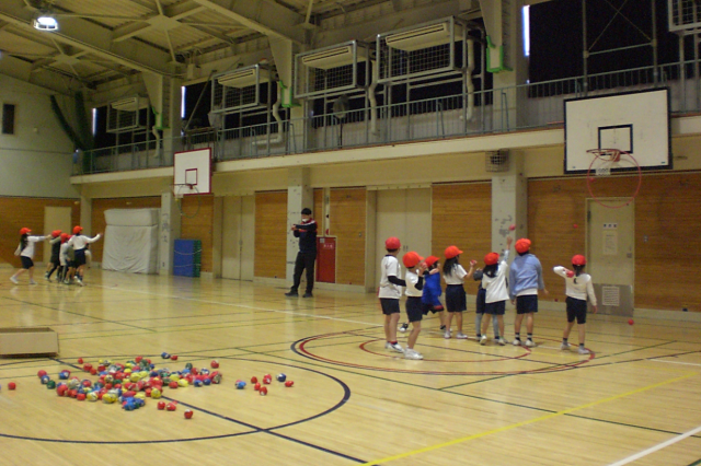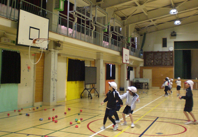 的をねらい、それぞれに工夫しながら、みんな楽しそうに球を投げ入れていました。