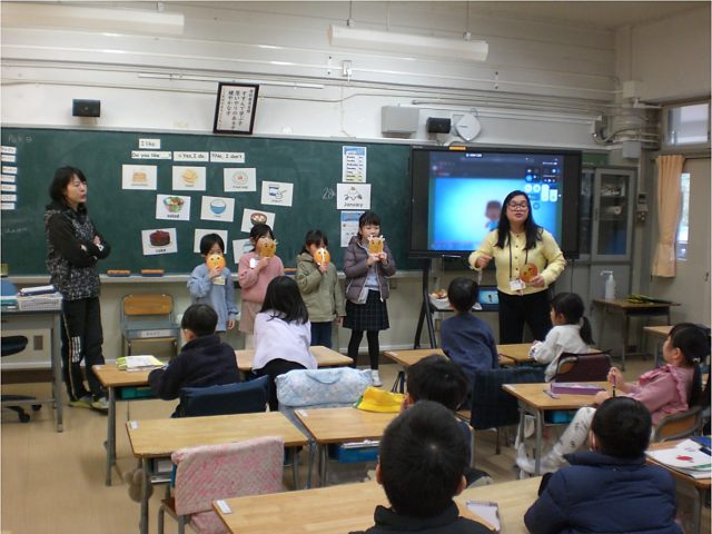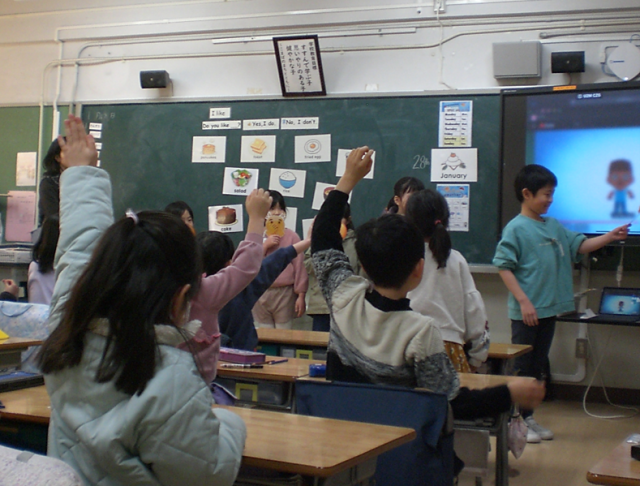 外国語活動の授業では、歌やゲームなどをまじえて”好きな食べ物はなに?”という活動をしました。