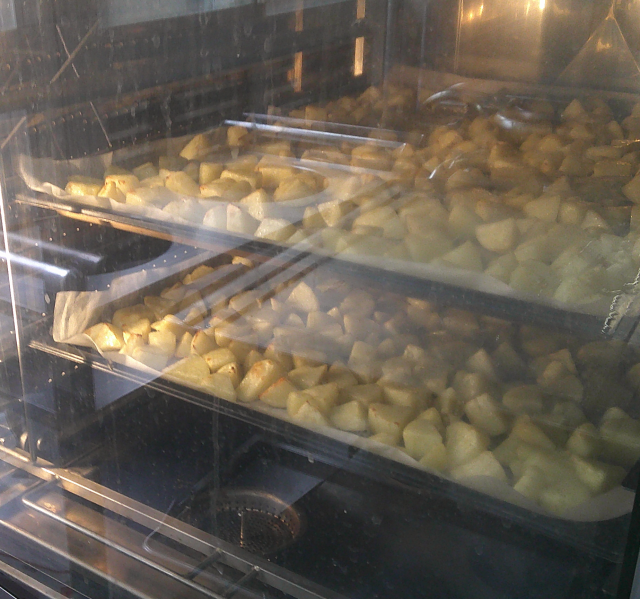 ソース焼きそばは、スチームコンベクションオーブンで野菜を蒸し、麺を蒸し、回転釜で炒めた具と合わせました。水っぽくならずにおいしくできました。じゃがバターもスチームコンベクションオーブンでじゃがいもを蒸してから、豆乳バターで和え、こんがり焼きました。ホクホクのじゃがいもの食感とバターのコクがおいしいです。フルーツポンチは、砂糖と水を煮た手作りのシロップと缶詰のフルーツを合わせました。各教室で配る直前に、冷やしたサイダーを注いでもらいました。やさしい甘さのひんやりデザートです。「焼きそば大好き!」と1年生の児童が声をかけてくれました。今日もよく食べてくれました。