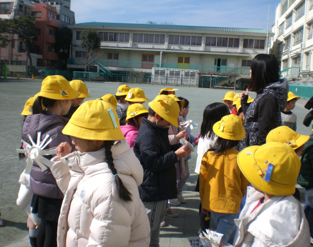 生活科の学習で、教科書を参考に、冬の風を利用して外で遊べるおもちゃを作りました。